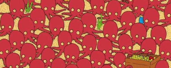 Mēģiniet atrisināt sarežģītu, bet jautru optisko ilūziju – zivs diezgan labi paslēpjas starp astoņkājiem, un jums joprojām ir jāmēģina to atrast.