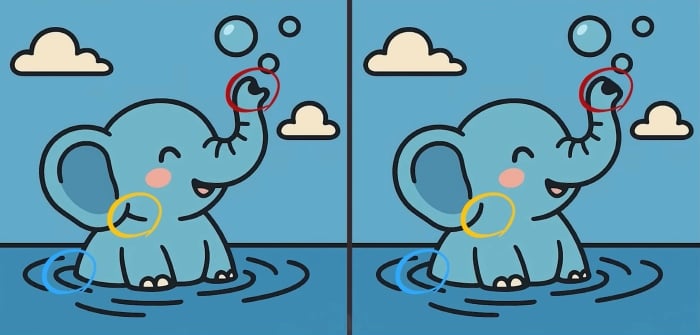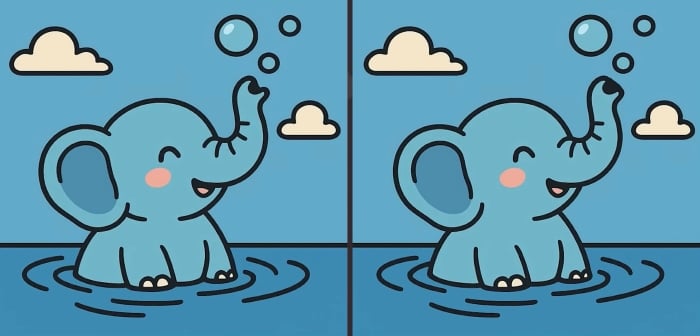 Šeit ir divi attēli, kuros zilonis spēlējas ūdenī. No pirmā acu uzmetiena tie ir absolūti identiski, taču tā ir tikai ilūzija. Attēlos ir paslēptas trīs nelielas atšķirības.