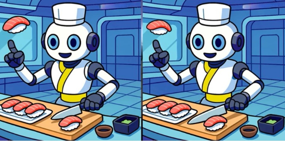 Piedāvātajos attēlos redzams robots suši cilvēks. No pirmā acu uzmetiena abi zīmējumi izskatās pilnīgi vienādi, taču starp tiem ir paslēptas trīs nelielas atšķirības.