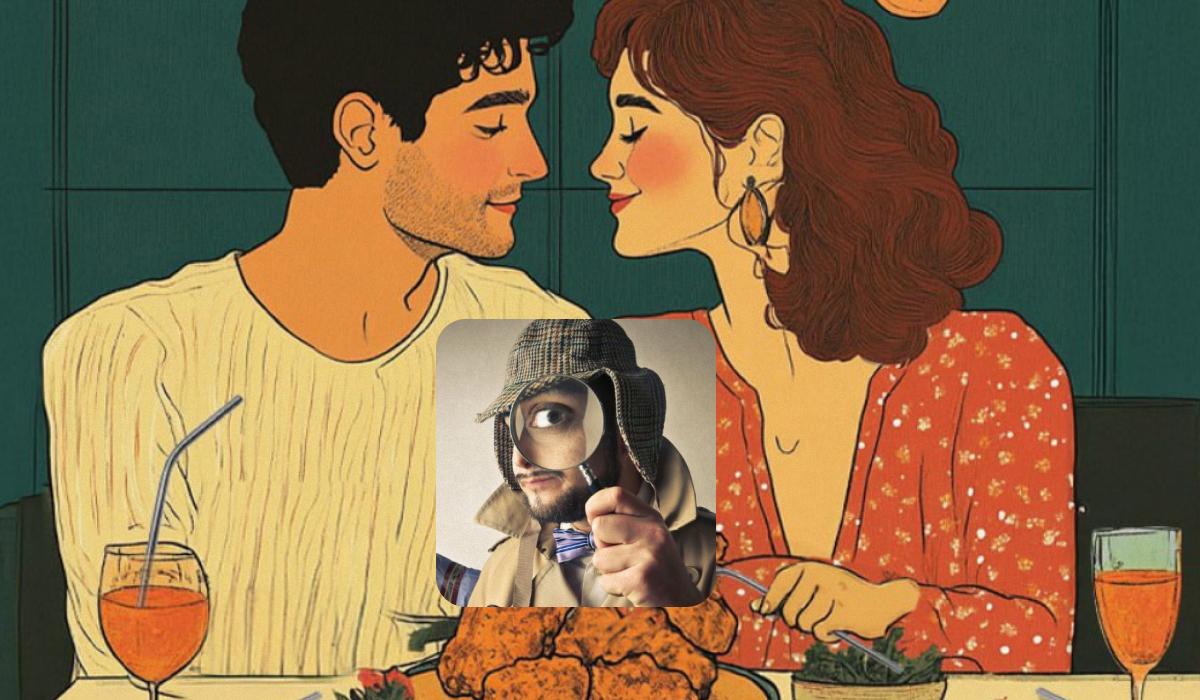 Šeit ir iemīlējies vīrietis un sieviete, kuri patīkami sazinās romantisku vakariņu laikā. Meitene ģērbusies elegantā kleitā, bet puisis – vieglā džemperī. Uz galda var redzēt dzērienu glāzes un dažus gardus ēdienus. Iestādes sienās karājas gleznas un pie griestiem karājas spuldzes.