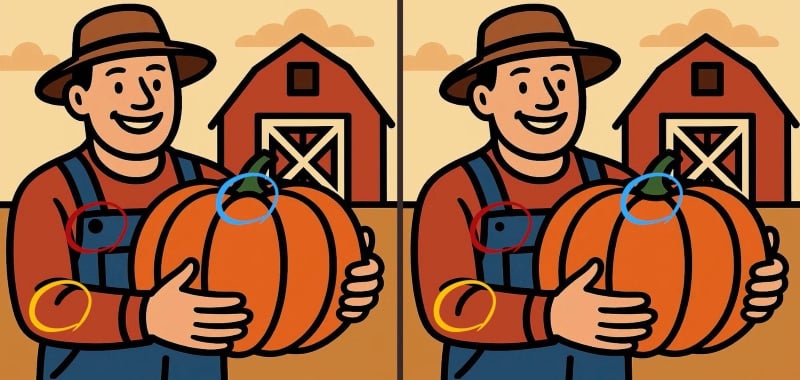 Šoreiz redzat attēlu ar zemnieku un ķirbi. No pirmā acu uzmetiena attēli pilnībā sakrīt, taču tas tā nav – starp tiem ir paslēptas trīs atšķirības.