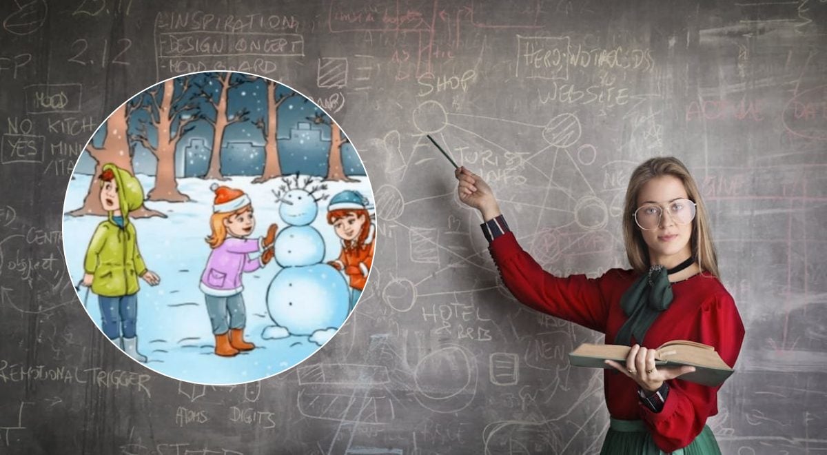 Attēlā redzami trīs bērni sniegotā mežā: divi veido sniegavīru, bet viens tur ragavas. Ap tiem ir vairāki koki. Kaut kur šajā ainā bija paslēpts briedis.