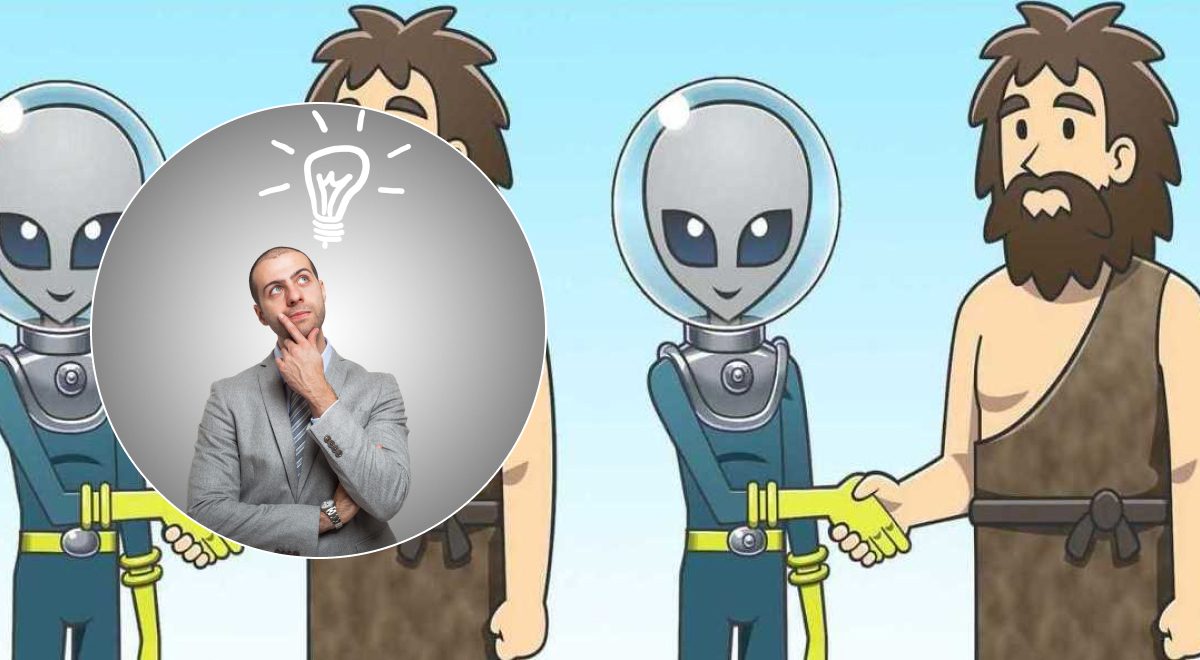 Parādītajā attēlā var redzēt divus identiskus citplanētiešus un divus alu cilvēkus.