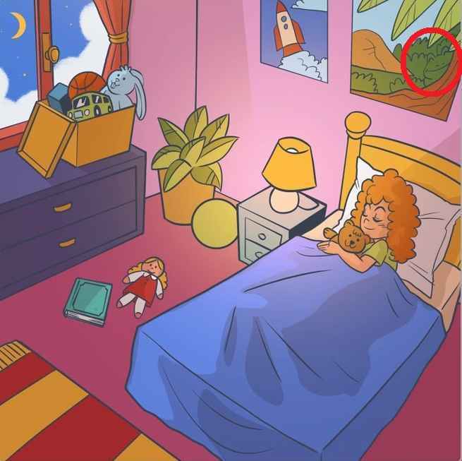 Attēlā redzama meitene, kas guļ guļamistabā. Viņa apskauj lāci, viņai pa labi ir lelle, klade, bet stūrī uz skapja ir kaste ar citām rotaļlietām. Tavs uzdevums ir atrast, kur atrodas varde. Viņa paslēpās ļoti tuvu.