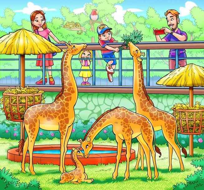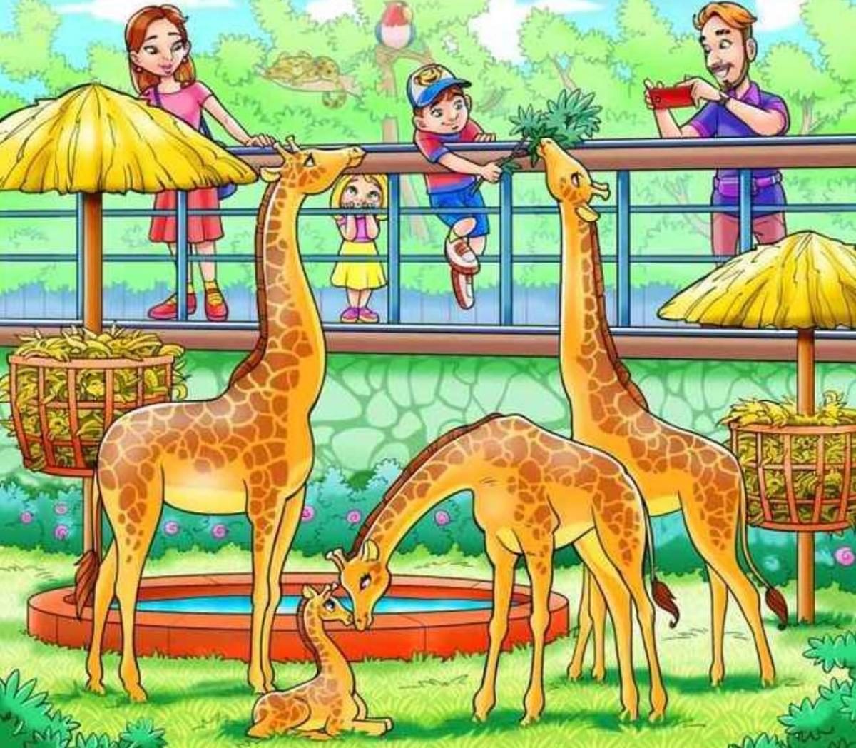 Attēlā redzama ģimene zoodārzā. Vīrietis filmē žirafes savā telefonā, bet viņa bērni un sieva vēro dzīvniekus. Šeit kaut kur ir paslēpies pērtiķis, kurš jums jāatrod.