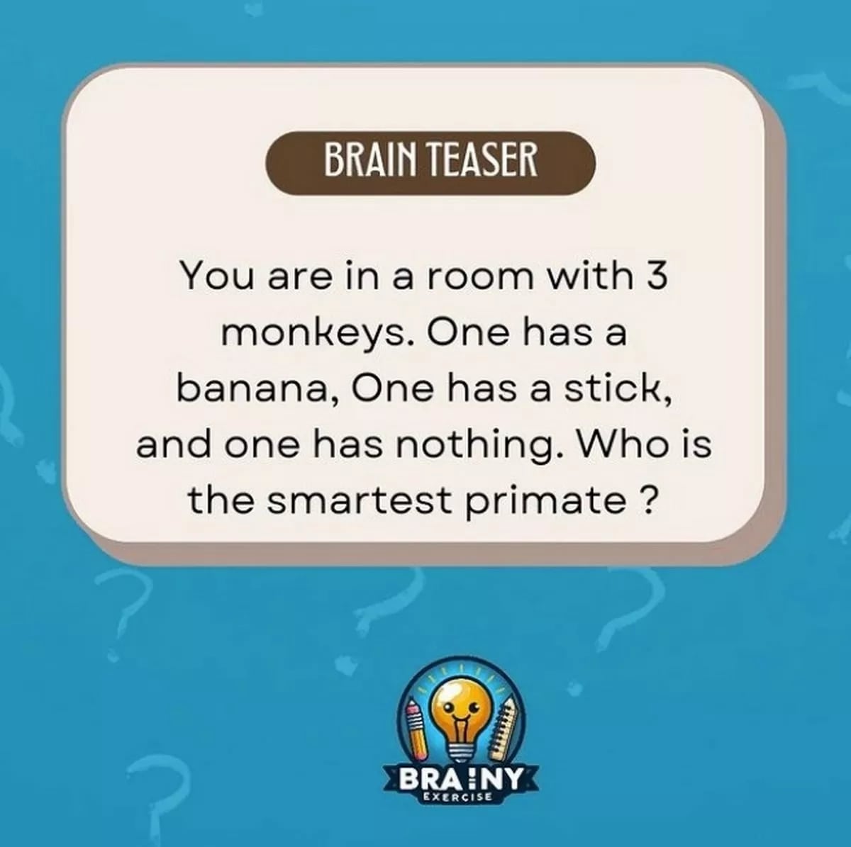 The Mirror publicēja vienu no tiem, un jums būs tikai 30 sekundes, lai to atrisinātu, un mīkla skan šādi: “Istabā ir trīs pērtiķi. Pirmajam rokās ir banāns, otrajam ir nūja, bet trešajam nav nekā. Kurš ir gudrākais primāts?”
