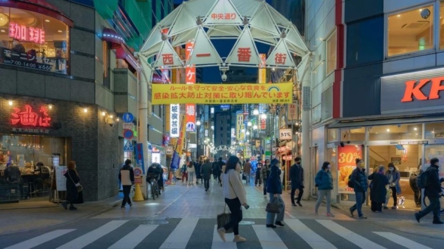 Attēlā redzam metropoles gājēju ielu, kas iet starp augstām ēkām. Vakara ielu, pa kuru pārvietojas daudzi cilvēki, apgaismo liels skaits laternu.