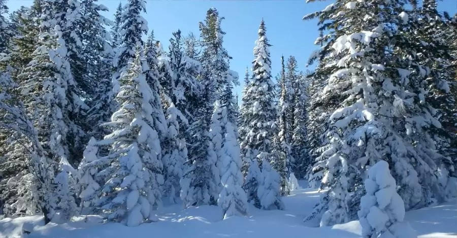 Attēlā redzams skujkoku mežs ziemā. Koki ir tik sniegoti, ka lielākajai daļai no ziemas sniegpārslu smaguma noliecas pat zari. Zemi klāj arī bieza sniega sega.