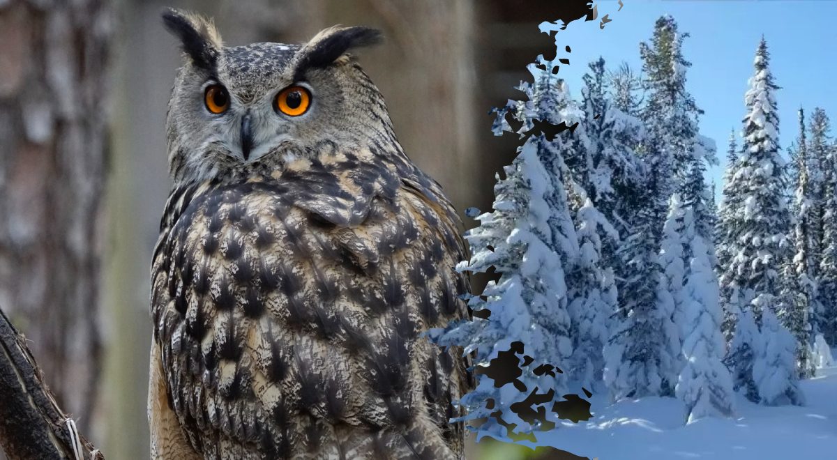 Pūce mežā jāatrod 16 sekundēs / kolāža: galvenā redaktore, foto: fresherslive, unsplash.com