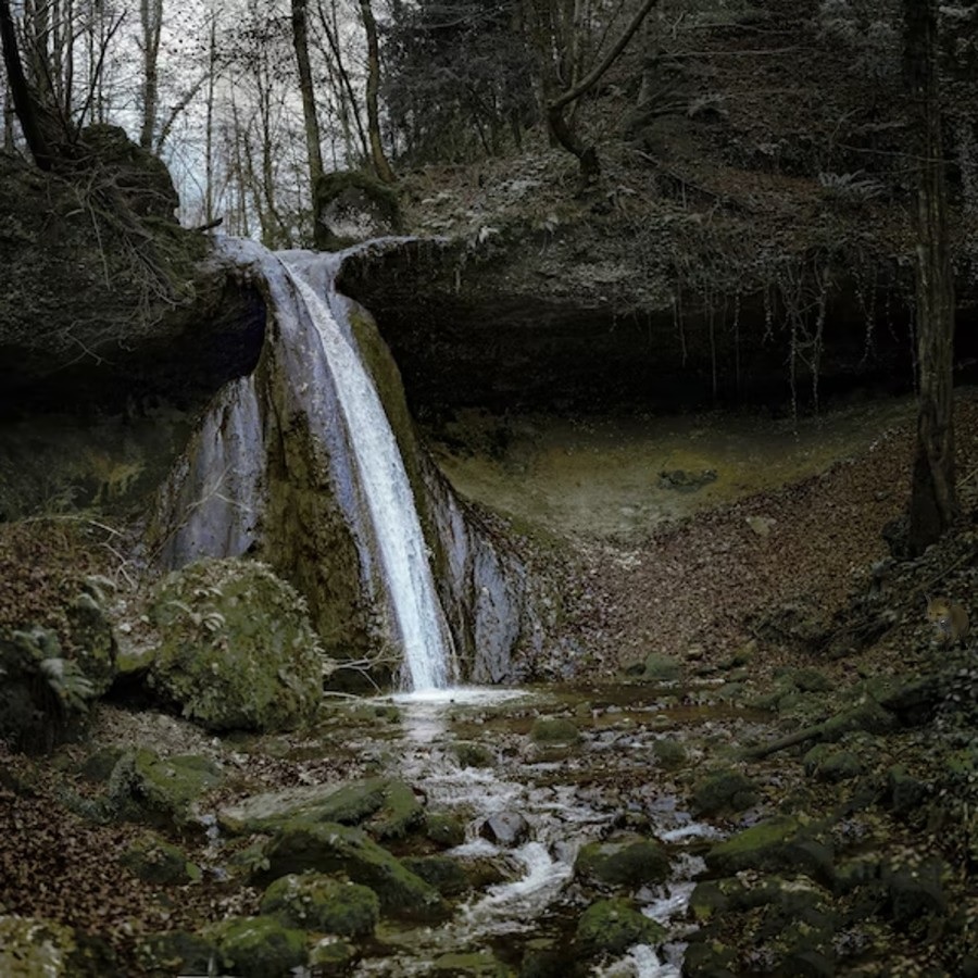 Fotoattēlā redzam meža ainavu ar ūdenskritumu. Ūdens krīt uz sūnām klātajiem akmeņiem, kas atrodas zemāk. Un mežu ierāmējošā krāsu shēma liek domāt, ka attēlā ir attēlota rudens ainava.