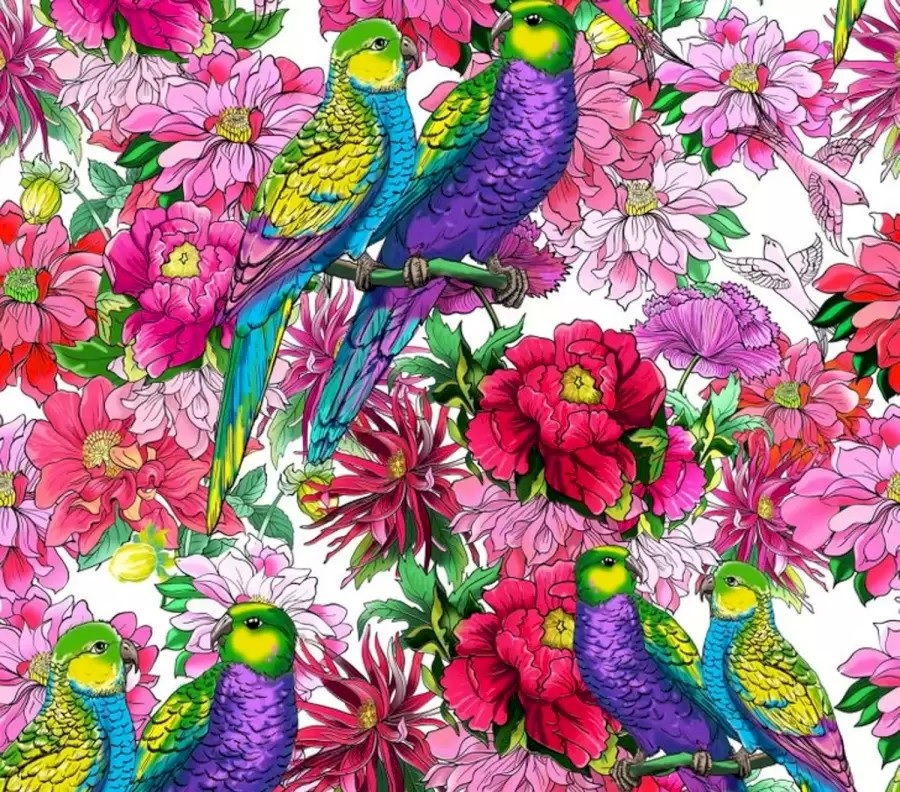 Jūsu acu priekšā ir spilgts attēls ar daudziem ziediem un papagaiļiem. Putni sēž pa pāriem starp ziediem. Un šajā romantiskajā vidē sirds kaut kur ir paslēpta. Ne visi var precīzi redzēt, kur tas atrodas.