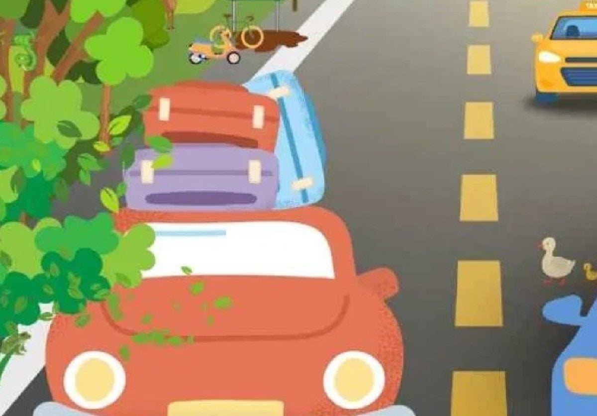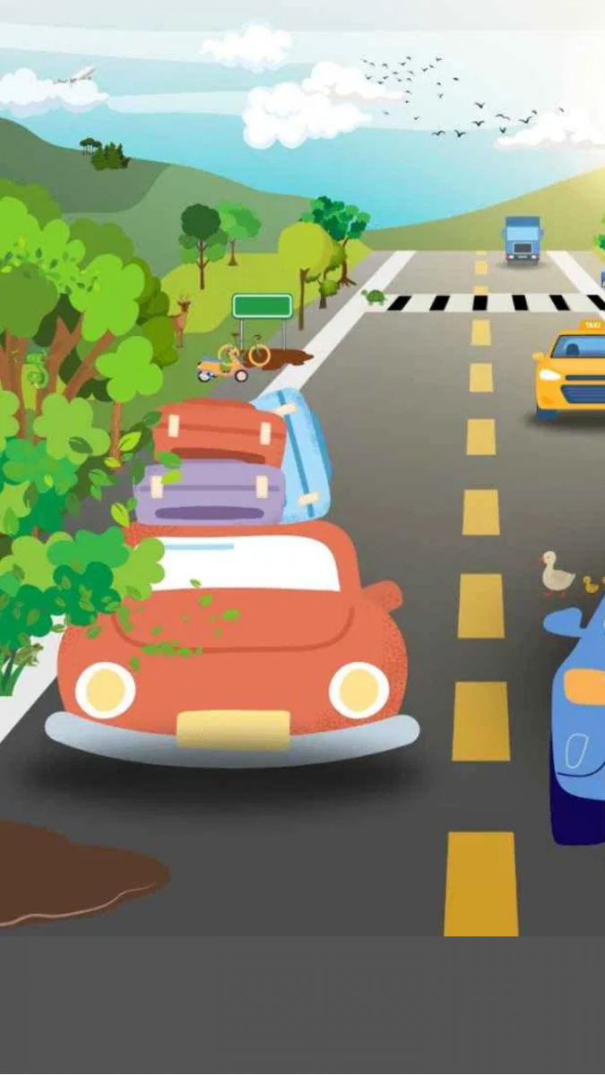 Attēlā redzams ceļš ar automašīnām. Centrālajā pozīcijā ir mašīna, iespējams, ar cilvēkiem, kas kaut kur pārvietojas. Ceļu šķērso pīle ar pīlēniem.