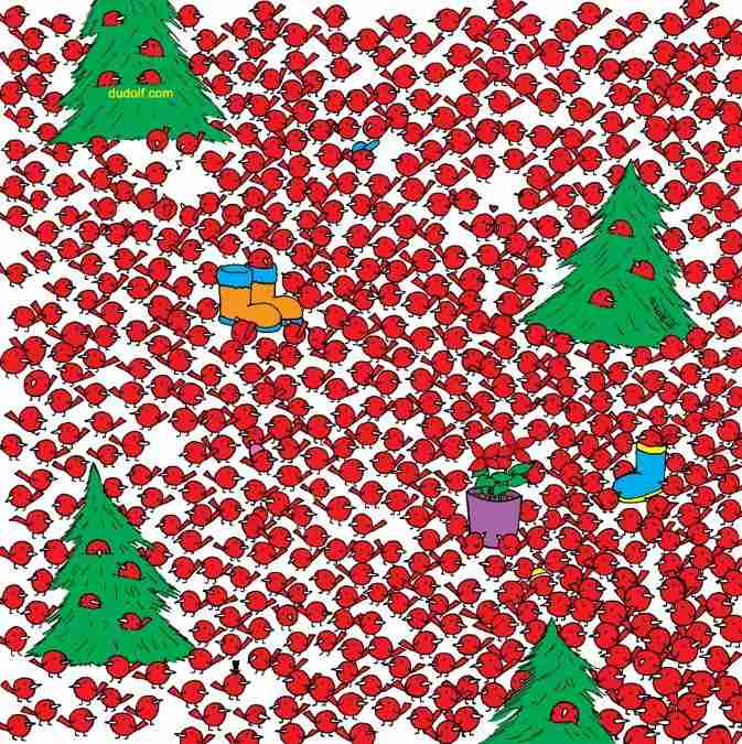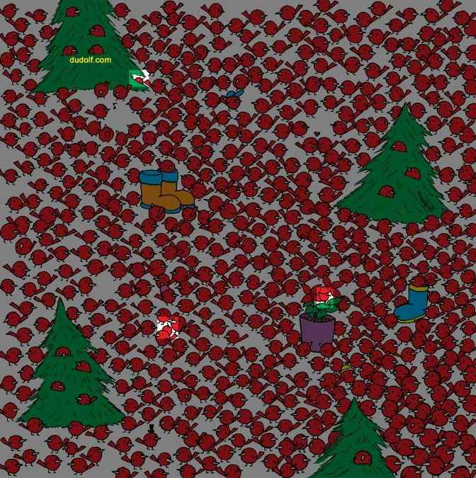 Mums ir arī mīkla tiem, kam ir lieliska redze. Attēlā ir daudz tukānu, un kaut kur starp tiem ir paslēpies pingvīns. Dzīvnieki ir ļoti līdzīgi, kas ievērojami apgrūtina meklēšanu.