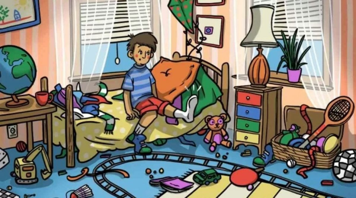 Attēlā redzams puisis istabā ar daudzām dažādām lietām. Viņš meklē, kur nokļuva kurpe. Mūsu uzdevums ir atrast apavu.