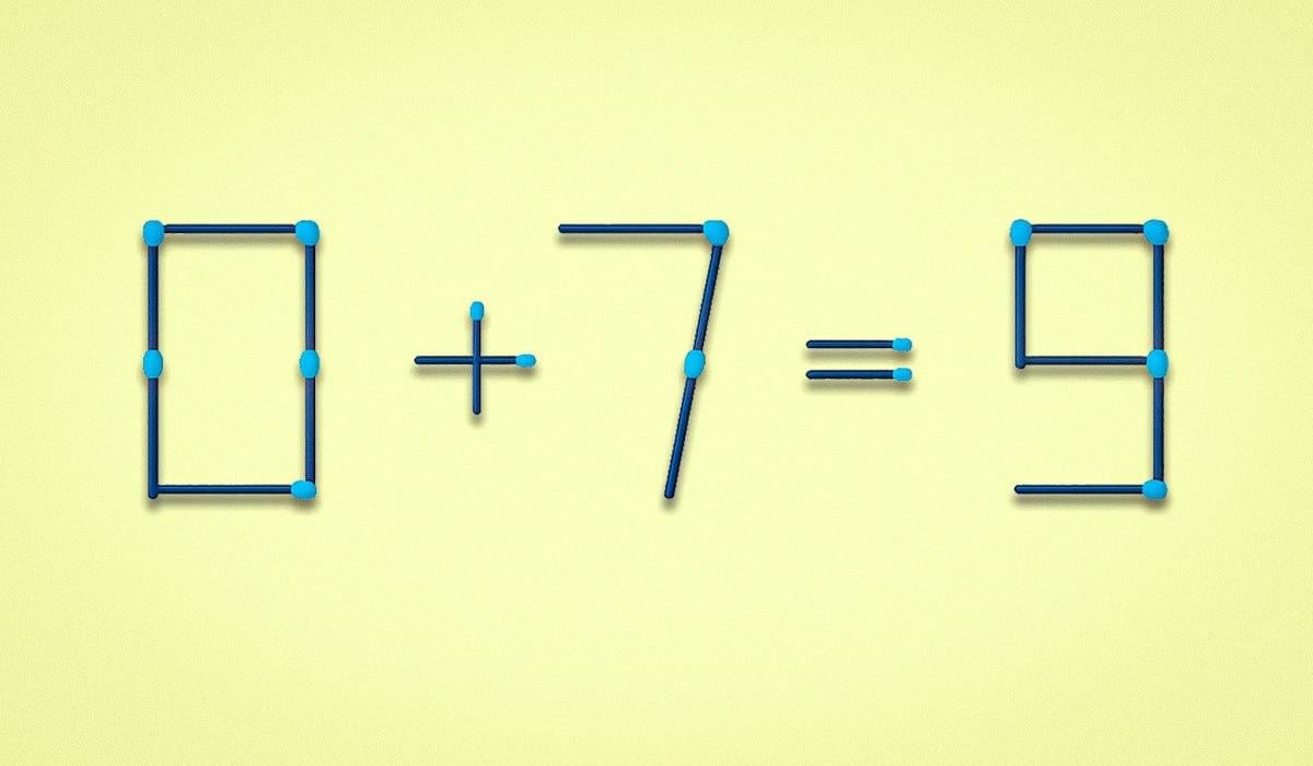 Zemāk jūs redzēsiet attēlu, kurā vienādība 0+7=9 ir izkārtota, izmantojot sērkociņus. Tajā ir kļūda, kas jums ir jānovērš.