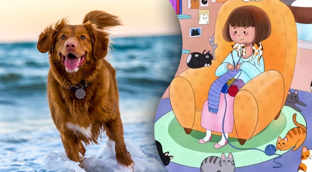 Attēlā redzam istabu, kuras vidū uz krēsla sēž meitene. Viņa kaut ko ada. Tikmēr ap viņu pulcējās daudzi kaķi. Katrs no kaķiem nodarbojas ar savām lietām – daži guļ, bet daži spēlējas. Bet kaut kur bildē lūr suns. Vai jūs varat viņu atrast?